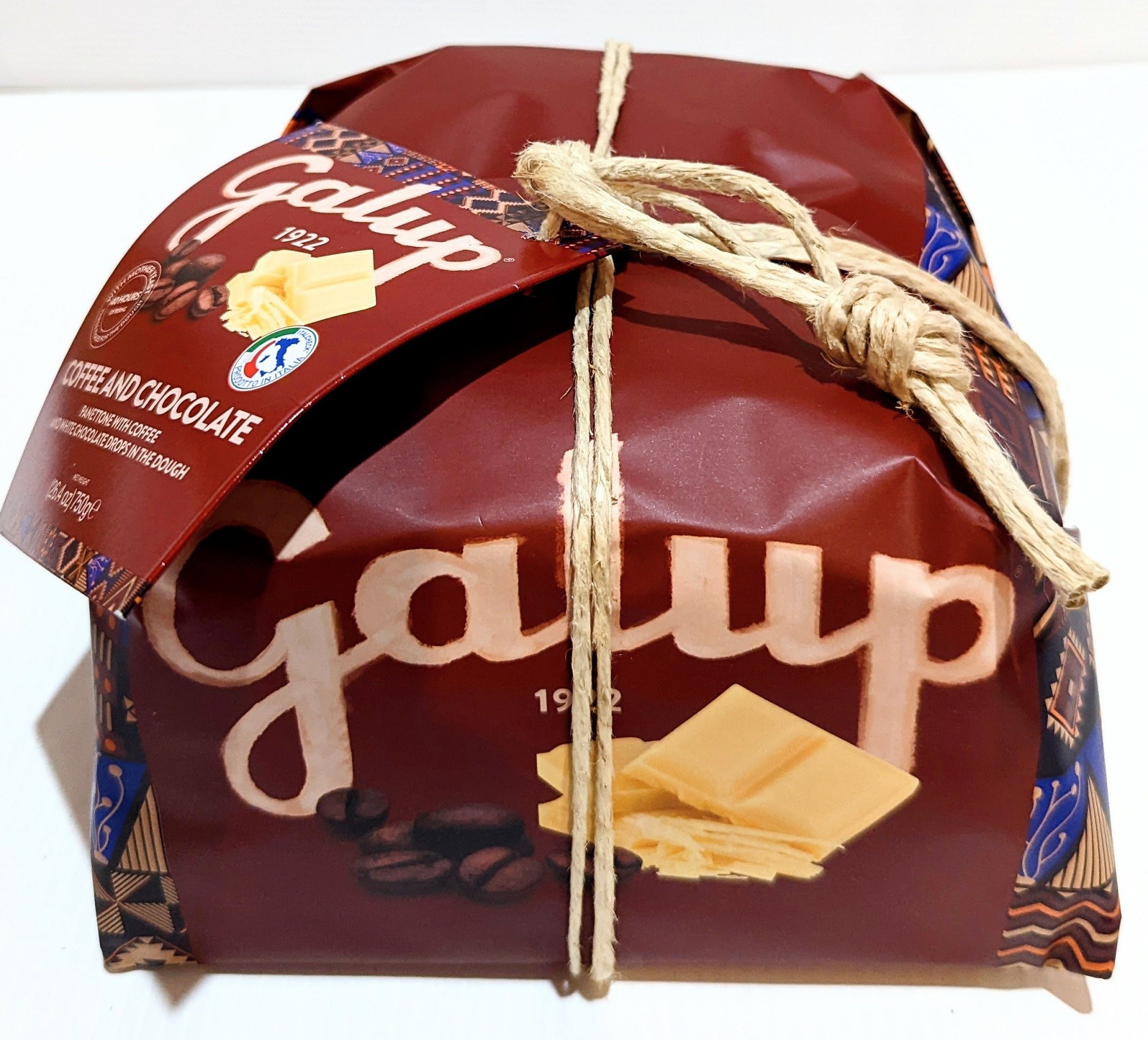 Galup panettone with coffee, white chocolate drops and hazelnut frosting, without sultanas and citrus candied fruits.