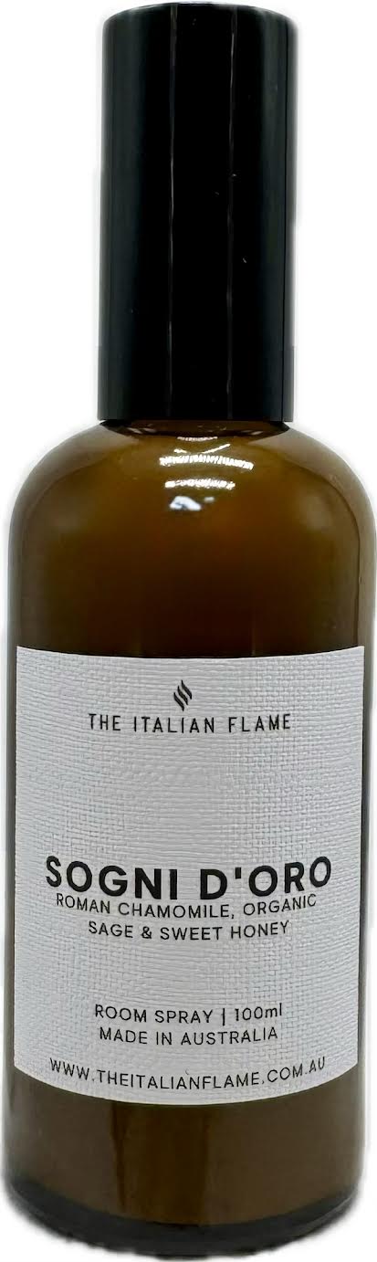 A relaxing and calming room spray with top notes of Roman chamomile and base notes of organic sage and sweet honey. Sogni d'Oro which translates to 'sweet dreams' in Italian is a blended scent that will add instant peacefulness to your space. We take inspiration from the Sogni d'Oro Italian tea that we drink when we need a good night rest. Our room sprays have a unique blend of essential oils that are perfect for elevating your space and can be used in your home, office space or to freshen up linen or the inside of your closet. Spritz into the air as often as desired to enliven the mind and satisfy the senses. Avoid contact with the eyes and skin.