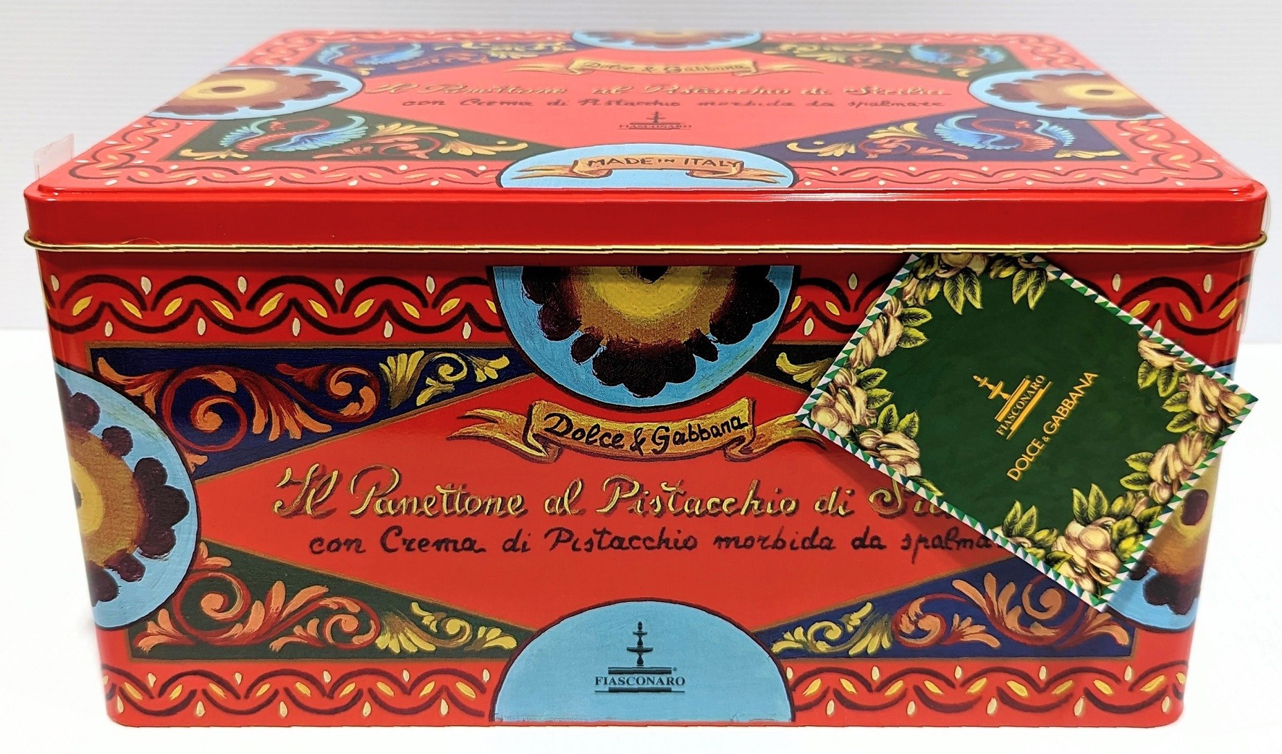 This delicious Fiasconaro panettone with pistacchio cream inside and covered 1Kg, in a beautiful Dolce e Gabbana designed tin.