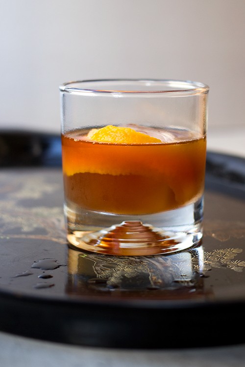 In a Cocktail Shaker, muddle sugar cube, Ginger and Bitters. Add the Syrup and Bourbon.