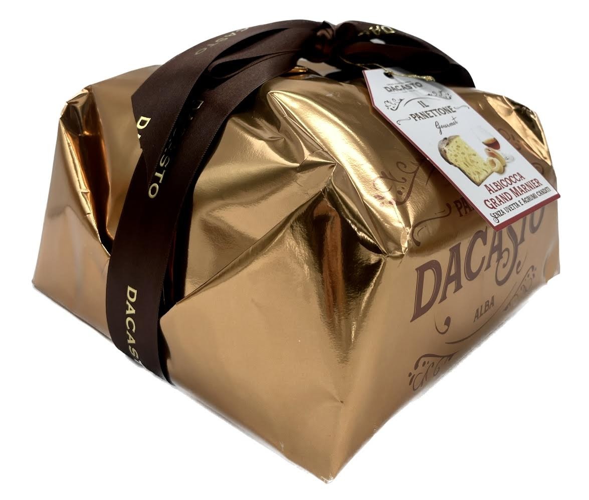 Decasto panettone with candied apricots and Grand Marnier liqueur, without raisins and citrus candied fruits.