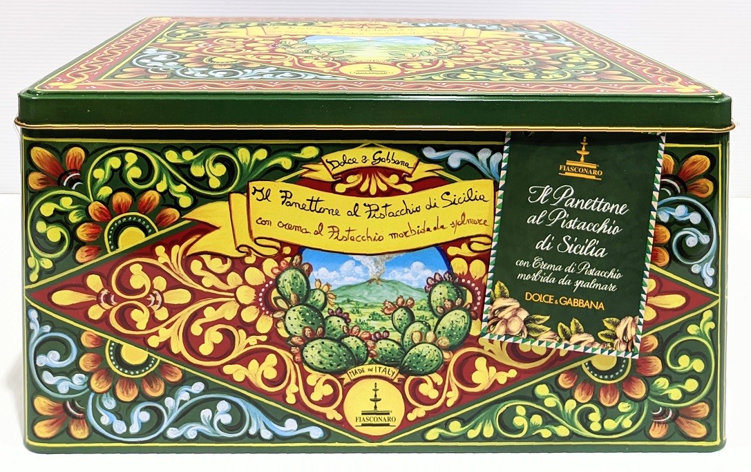 This delicious Fiasconaro panettone with pistacchio cream inside and covered 600g, in a beautiful Dolce e Gabbana designed tin.