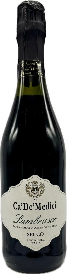 Ca' de' Medici Secco Lambrusco is a dry, sparkling red wine that offers a refreshing, fruity experience. It's known for its crisp, clean finish, making it a versatile choice for various pairings, like appetizers or simple Italian cuisine. While it may have a slight sweetness, it's not overly sweet, and the focus is on the natural acidity and fruit flavors of the Lambrusco grape