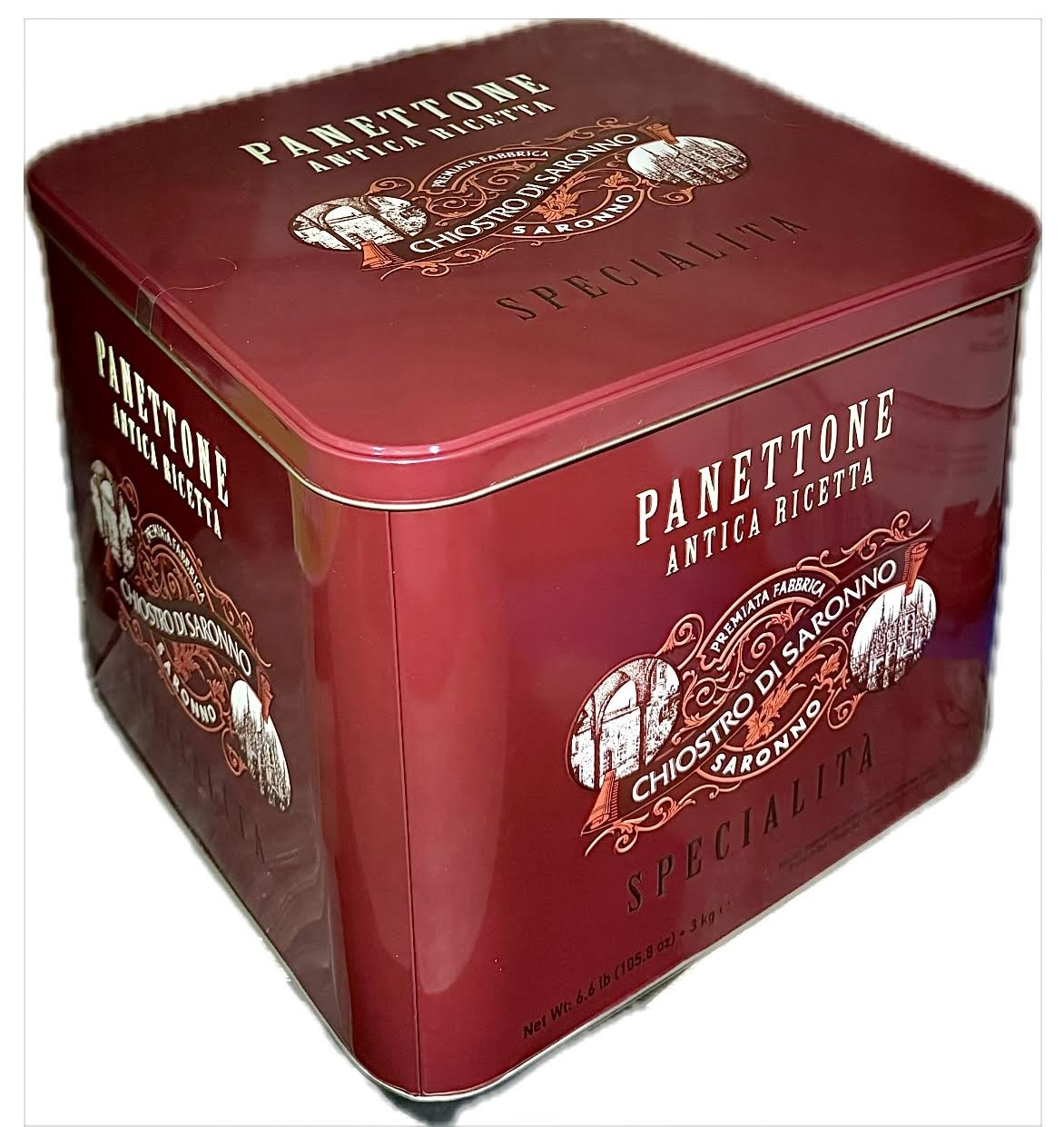 Panettone with raisins and candied peel, big metal tin Elegance. The Panettone Chiostro di Saronno is produced according to the traditional recipe and criteria, through a slow and natural leavening and all ingredients, from flour to milk, eggs to butter, candied fruit to yeast, are of natural origin strictly fresh and genuine, free of preservatives and colorant.
