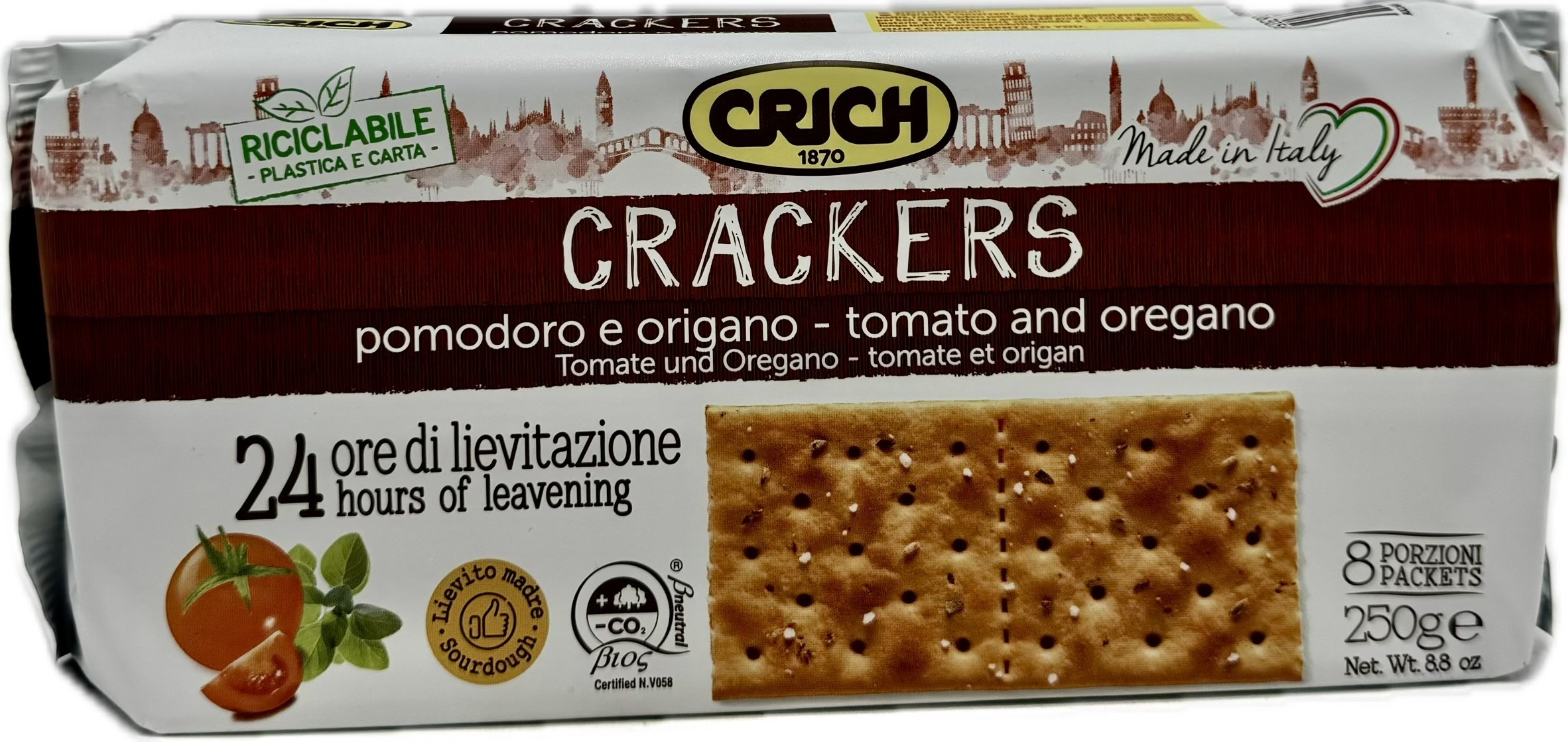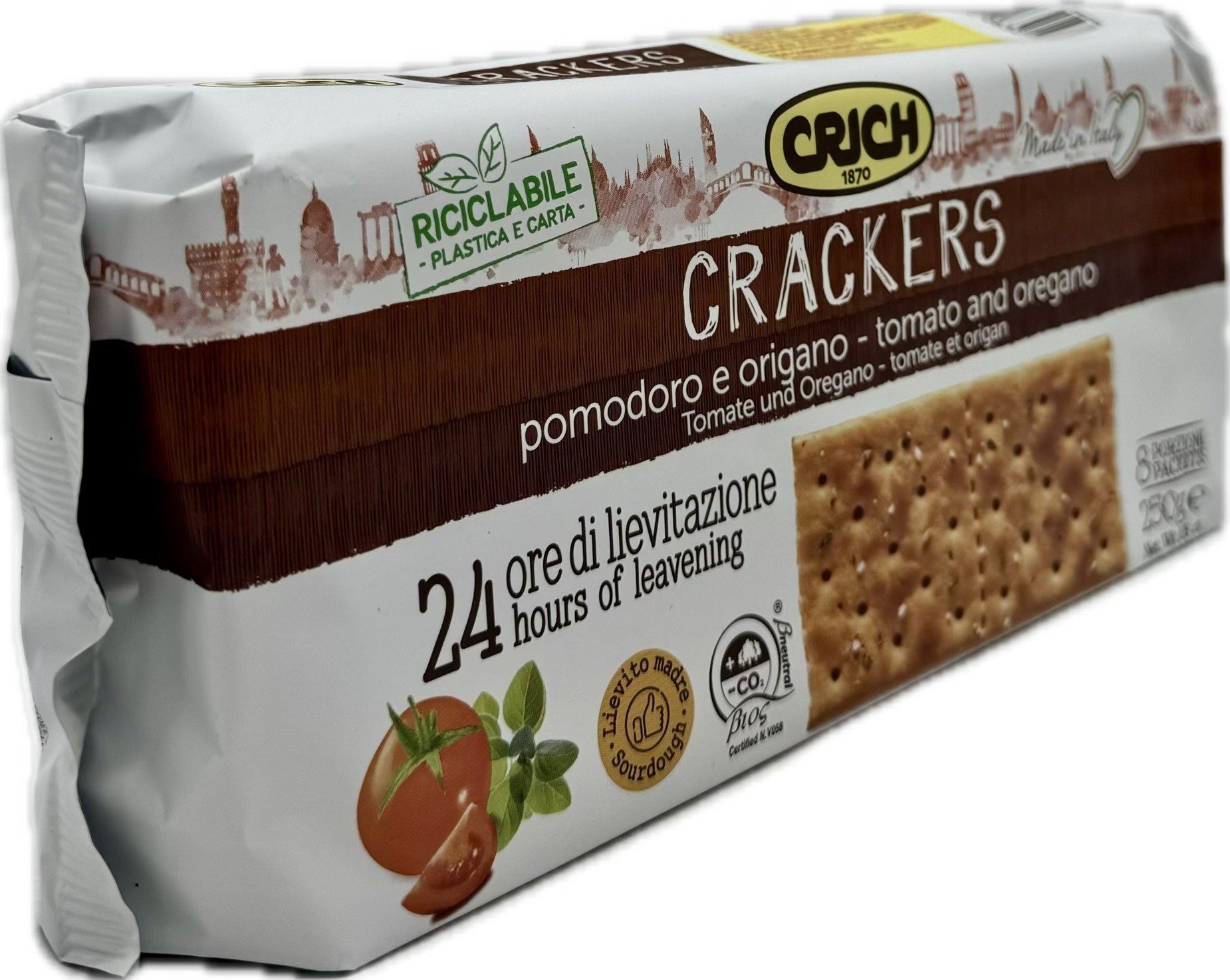 Crich Tomato Oregano Crackers are organic crackers with a distinct tomato and oregano flavor, made with extra virgin olive oil and a 24-hour leavening process for a delicate yet robust taste. They are suitable for snacking, pairing with sauces or salads, and are crafted with organic ingredients like tomato powder and oregano.