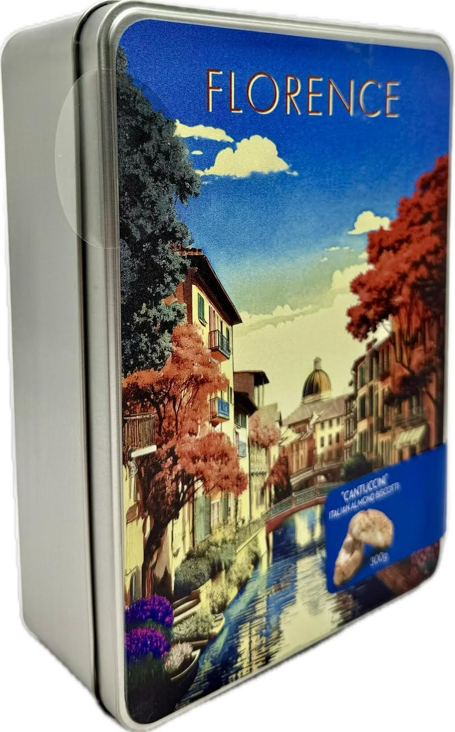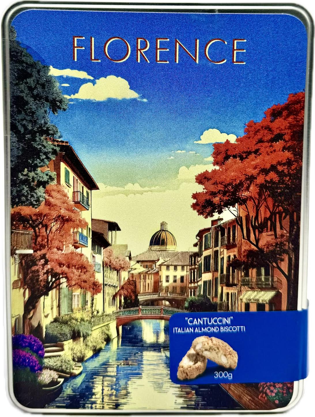 Italia Florence Tin Almond Biscuit 300g is a tin of traditional Italian almond biscotti (or cantucci) from Tuscany, made with a crunchy, twice-baked recipe. These biscuits are known for their authentic flavor and are traditionally enjoyed dipped in a dessert wine like Vin Santo, or with coffee or cappuccino. The tin itself is often collectible and features designs that pay homage to Florence.