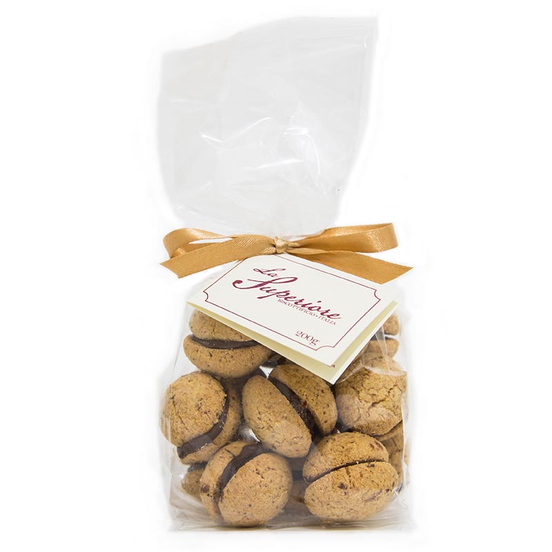 Made using the same ingredients for Baci di Dama Lemon, these biscuits are filled with a delicious chocolate cream. Known as “the most romantic biscuits”, the name Baci di Dama alludes to the unusual, though original, shape: two semi-spherical biscuits sandwiched together with a drop of dark chocolate resembling two lips intent on giving a kiss.
