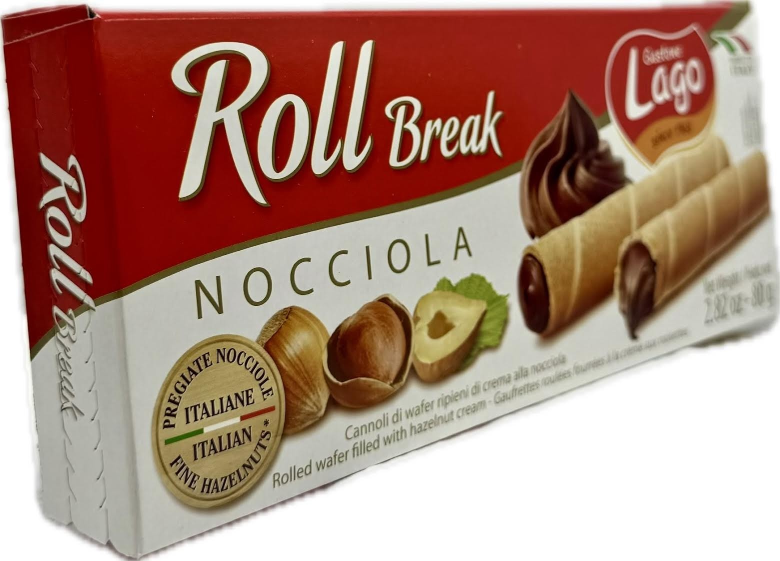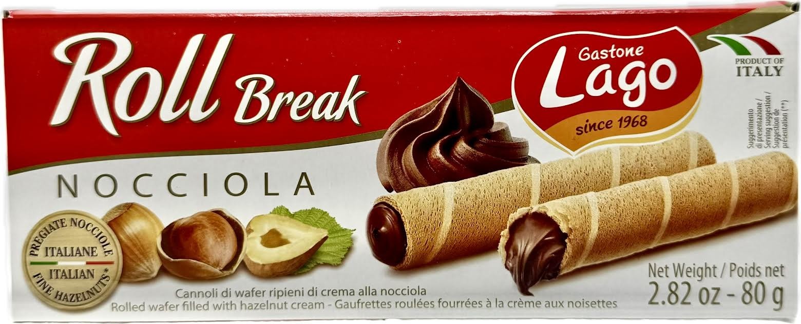 Lago Nocciola Hazelnut Roll Break Wafers are crispy, light Italian wafer rolls filled with a smooth, rich hazelnut cream. Made by Gastone Lago with carefully selected ingredients, these "Roll Breaks" are designed to be an indulgent yet satisfying snack for any occasion, from a coffee break to an after-meal treat or an accompaniment to ice cream and desserts.