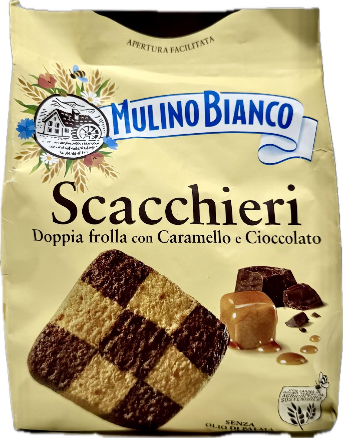 Scacchieri Chocolate and Caramel Biscuits are Italian shortbread biscuits featuring a double shortcrust pastry filled with caramel and covered in chocolate. This "surprising encounter" of flavors and aromas creates a unique, sweet biscuit that is ideal for breakfast or as a snack with coffee or tea.