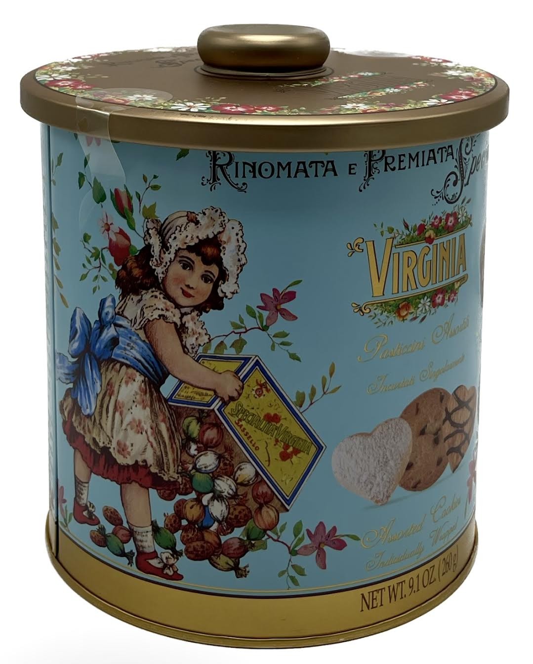 The Pasticcini Virginia follow the ancient and traditional recipe maintaining a high level of quality. These pastries are really delicious, made with raw material of premium quality and the love of the pastry chefs.Special care is also put in presenting these specialties, with the incessant conception of refined and exclusive confections that go along the classic ones, which bear witness to the treasured images of an age, pleasant memories of the art of good life. The light blue barrel tin is a really special gift idea!