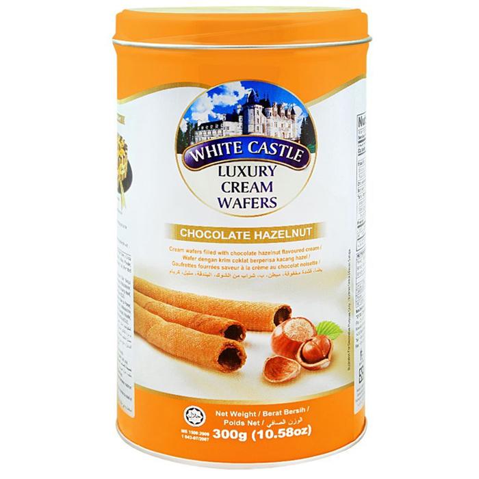 Cream wafers filled with chocolate hazelnut flavoured cream in a tin.