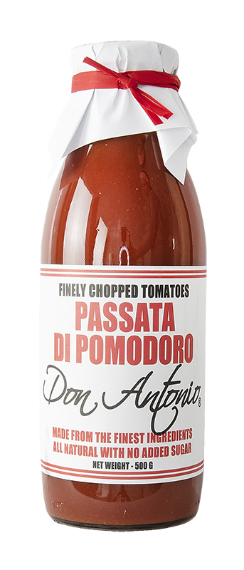 Don Antonio Tomato Passata consists of 100 percent Italian tomatoes (sieved) with sea salt. The tomatoes have been prepared using a traditional recipe of adding a very little salt, giving a tasty flavour
