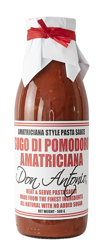 Don Antonio Amatriciana Sauce consists of 74 percent Italian tomato pulp and sieved cherry tomatoes with pork, extra virgin olive oil, white wine, sea salt, oregano and black pepper. This sauce is a traditional pasta sauce based with meat and is one of the best known sauces in Italian Cuisine.