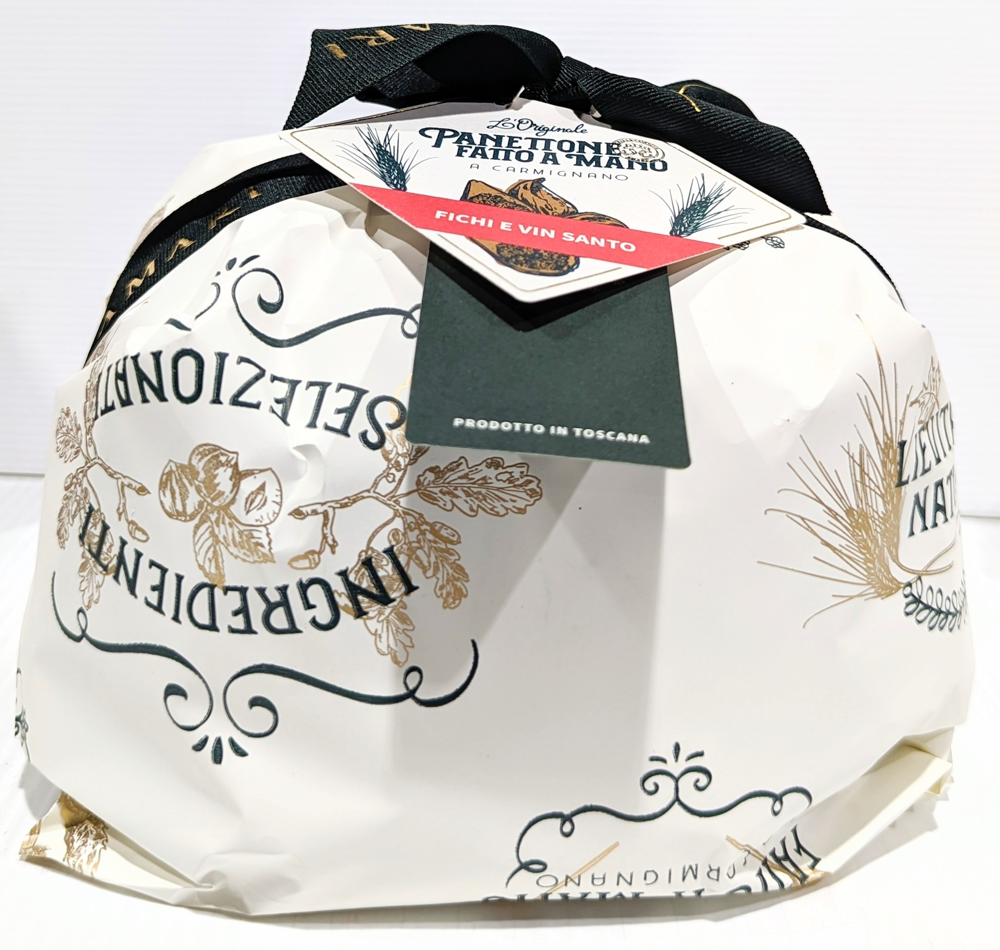Amari panettone with dried figs and Vin Santo wine, without candied fruits and raisins.