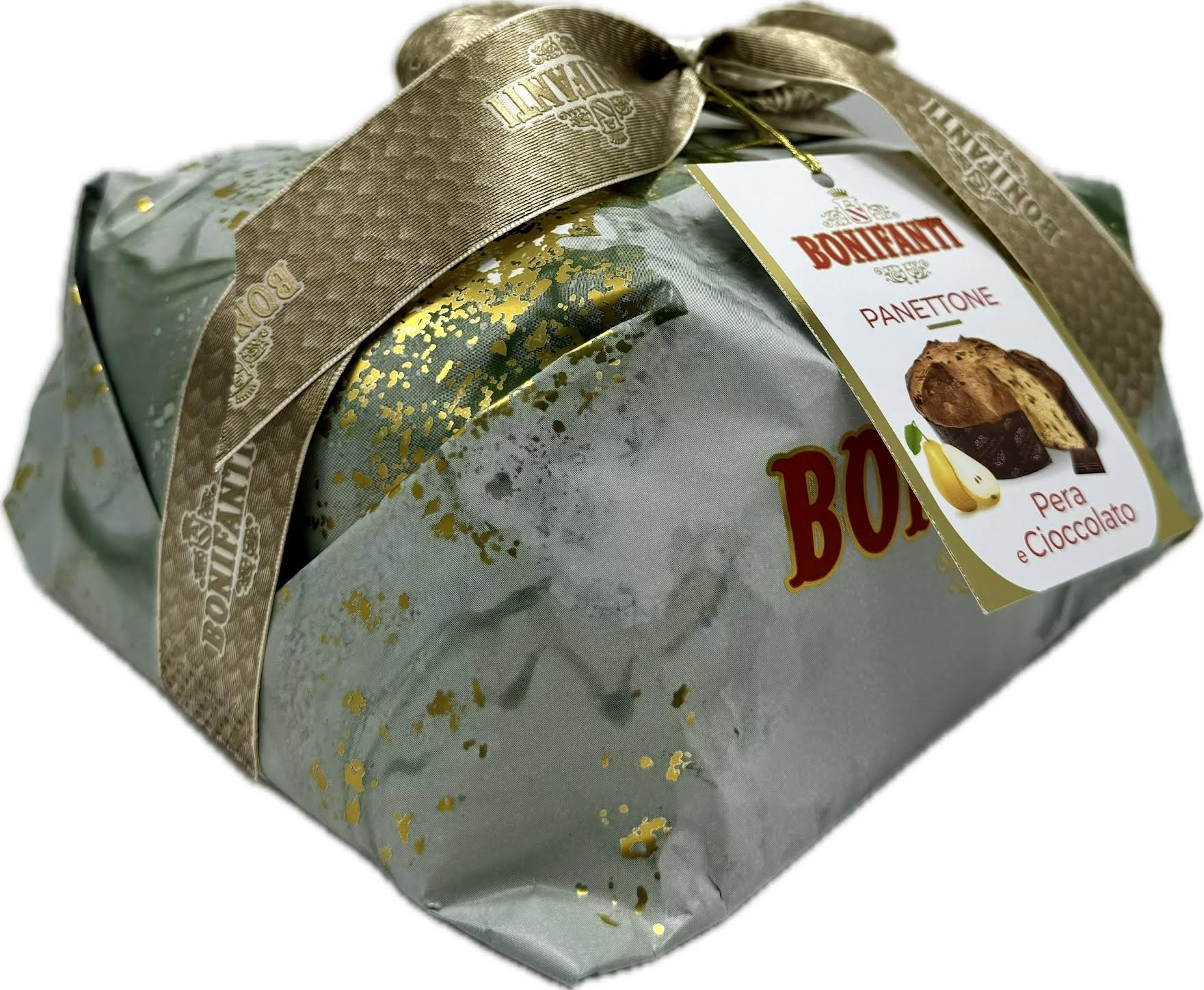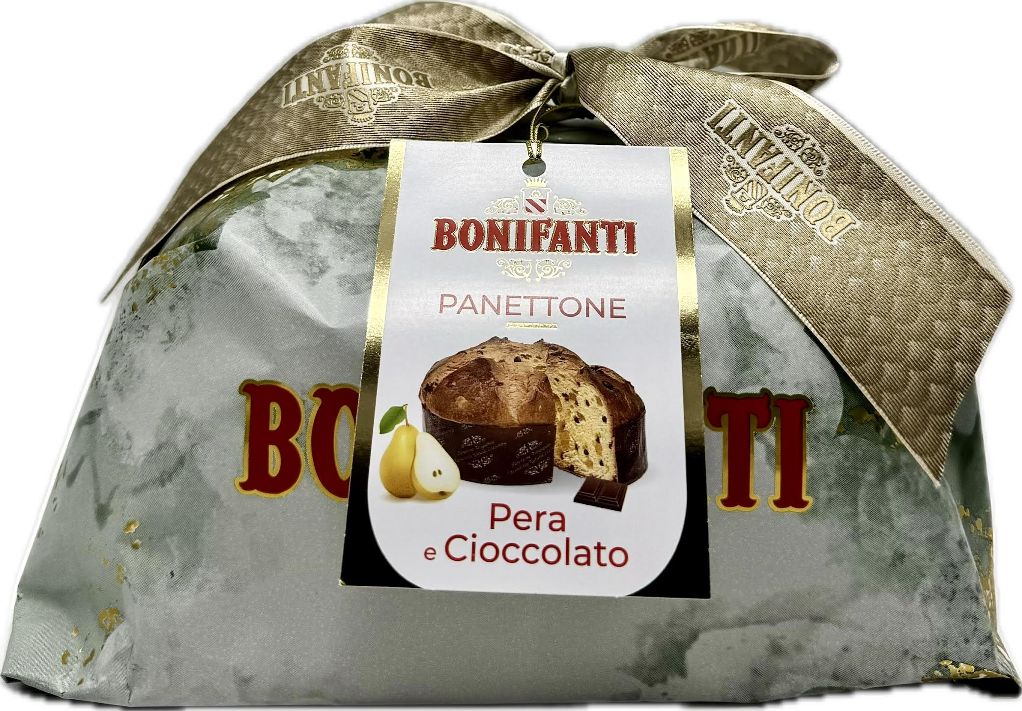 Bonifanti panettoni are always a delicious treat, like this version with pear and chocolate. The soft mixture contains pieces of candied pear and extra dark chocolate, making a truly mouth-watering cake. Contains no raisins or candied citrus fruits. Wrapped and tied by hand, it makes a perfect Christmas gift.