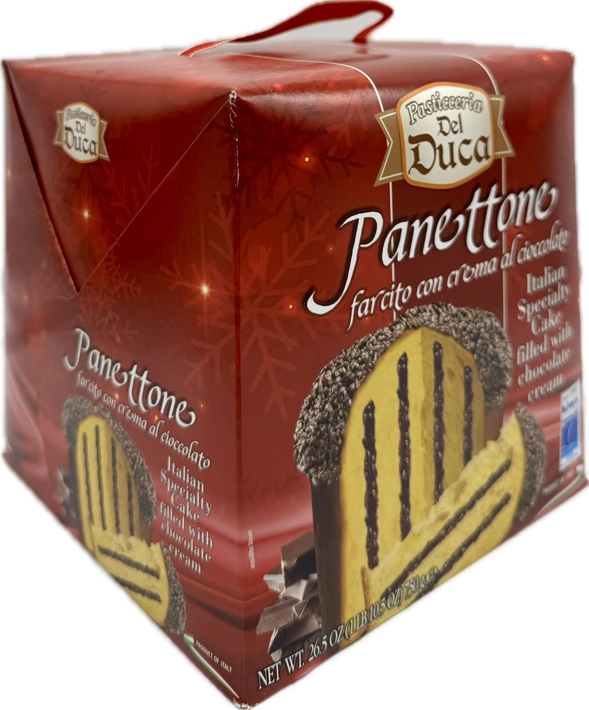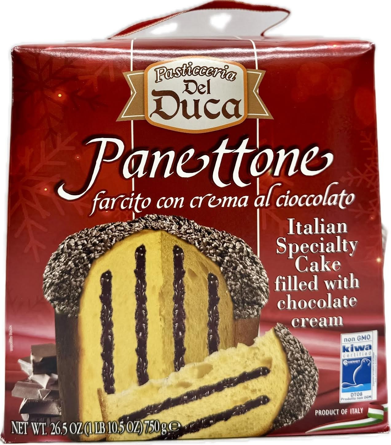 The Del Duca Chocolate Cream Panettone 750g is a classic Italian Christmas cake made with a soft, brioche-like dough, chocolate cream filling, and chocolate drops. It is a variation of the traditional panettone, which typically includes candied fruits and sultanas, but this version replaces them with decadent chocolate