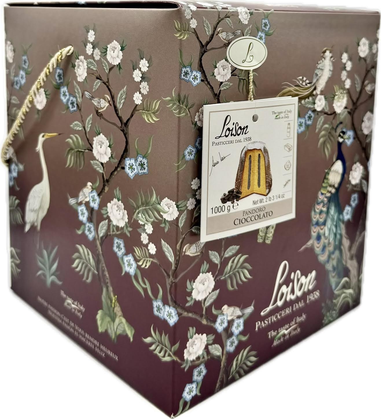 The Loison Armonia Chocolate Pandoro 1kg is a traditional Italian yeast-leavened cake with a soft, golden dough, enriched with a dark chocolate cream filling. It is made over 72 hours using a sourdough starter and fresh, natural ingredients like Italian free-range eggs, butter, and milk. The product comes with a packet of icing sugar for dusting before serving, which is recommended for a traditional finish.