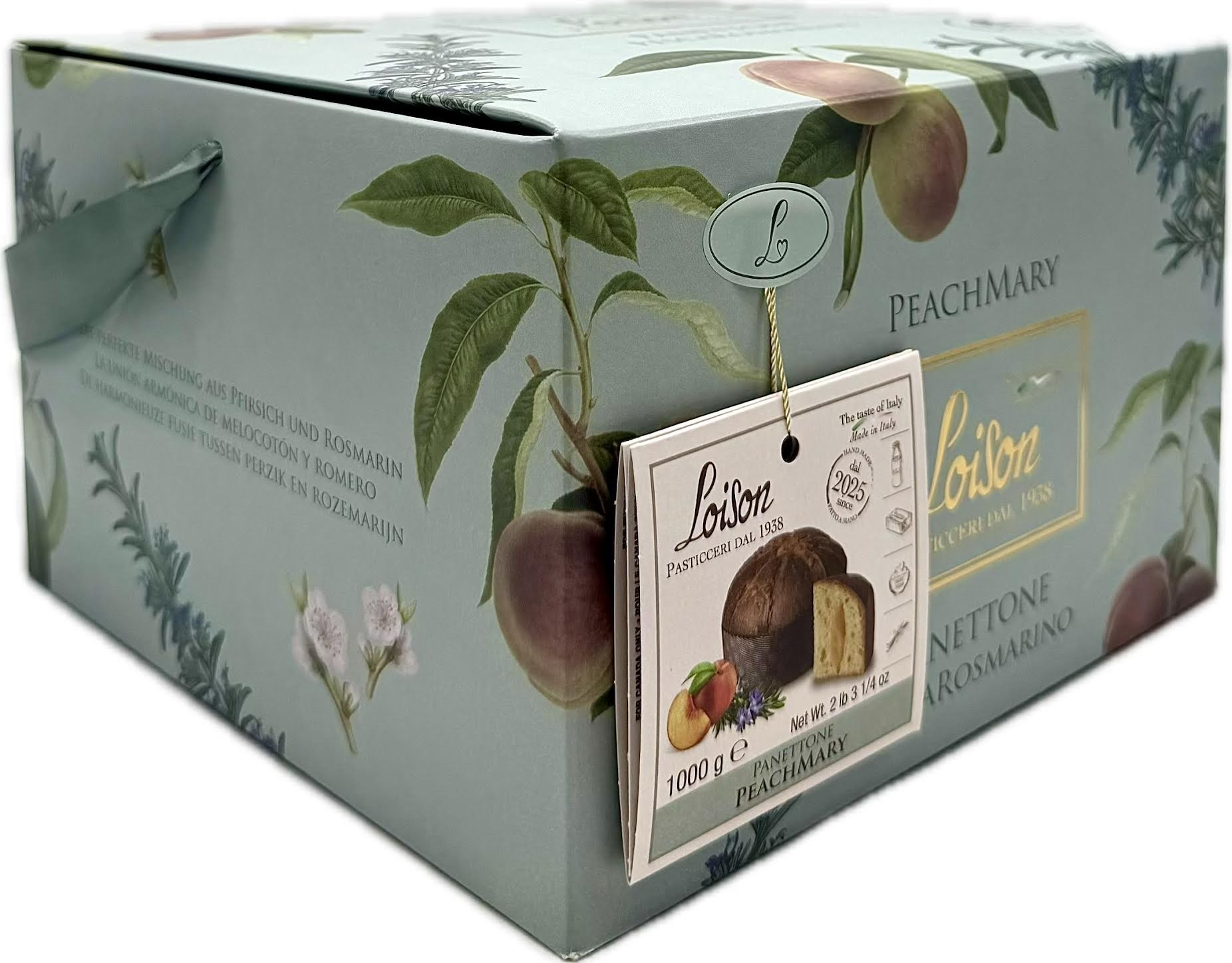 The artisan Panettone PeachMary is born from the meeting between the delicate taste of peaches and the intense aroma of rosemary: a original and elegant combination that satisfies the most refined palates. The yellow and well-fluted sponge is enriched with semi-candied peaches and richly filled with peach cream and notes of rosemary. The PeachMary Panettone is the result of 72 hours of patient craftsmanship and is naturally leavened from a dough of sourdough. The basic ingredients are all fresh: free-range Italian eggs, milk, cream and mountain butter.