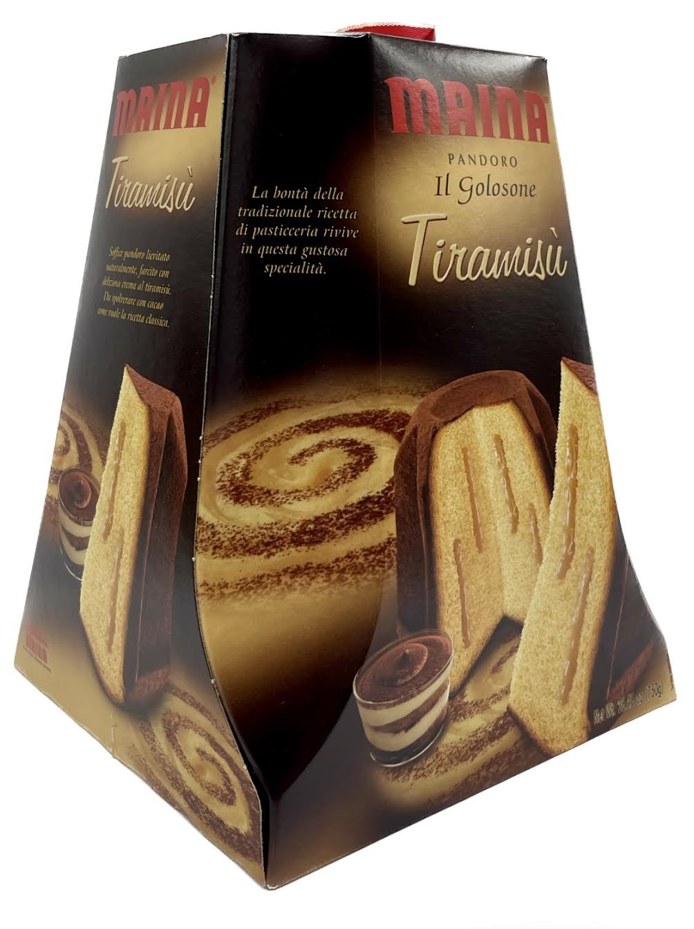 he goodness of the traditional pastry recipe comes alive in this tasty speciality. Soft naturally leavened Pandoro cake, filled with delicious Tiramisù cream, to be sprinkled with cocoa powder for the final touch.