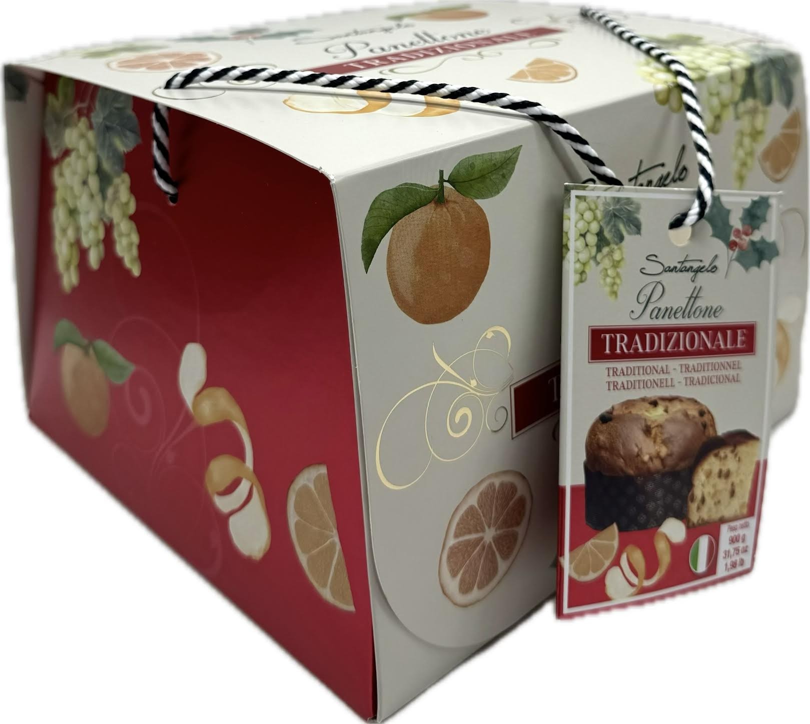 The Santangelo Panettone Traditional Floreal 900g is a naturally leavened, oven-baked Italian cake made with premium ingredients like butter, fresh eggs, and a mother yeast, according to a traditional recipe. It is enriched with raisins and candied orange peel, creating a soft, fluffy, and rich texture. The name "Floreal" suggests it may be presented in festive, flower-themed packaging, making it suitable for gifting.
