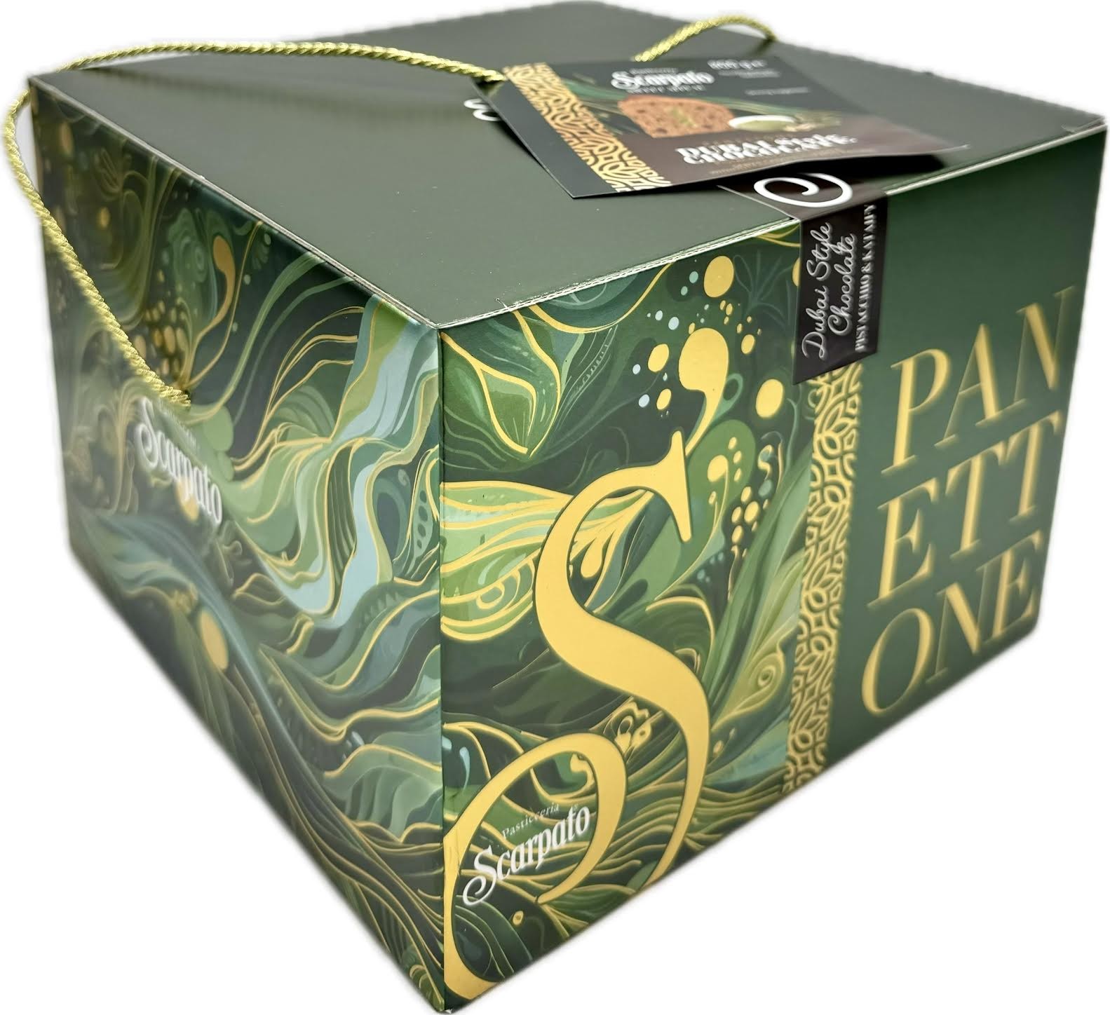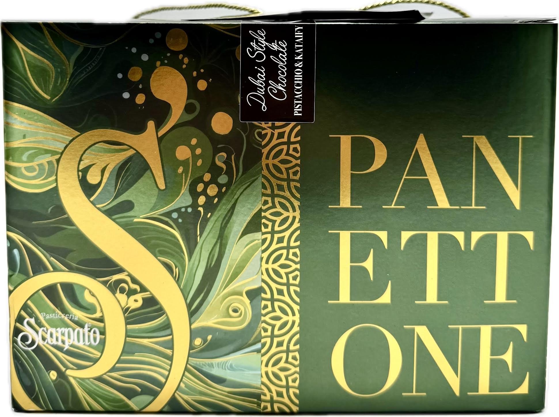 The Scarpato Dubai Style Chocolate Pistachio Panettone is an Italian panettone featuring a soft, naturally leavened dough with milk chocolate chips. It is filled with a rich pistachio cream and coated in Dubai-style chocolate, topped with crispy kataifi pastry. This combination of traditional Italian pastry with Middle Eastern flavors makes it an opulent and festive dessert, often packaged for gifting.