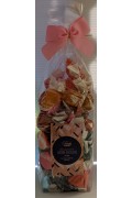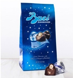 Silky dark chocolate enrobes a heart of gianduia (a luscious creamy blend of milk chocolate and ground hazelnuts) dotted with chopped hazelnuts and crowned with a whole hazelnut. Each confection is hugged with a love note and is wrapped in Baci’s signature silver and blue foil.