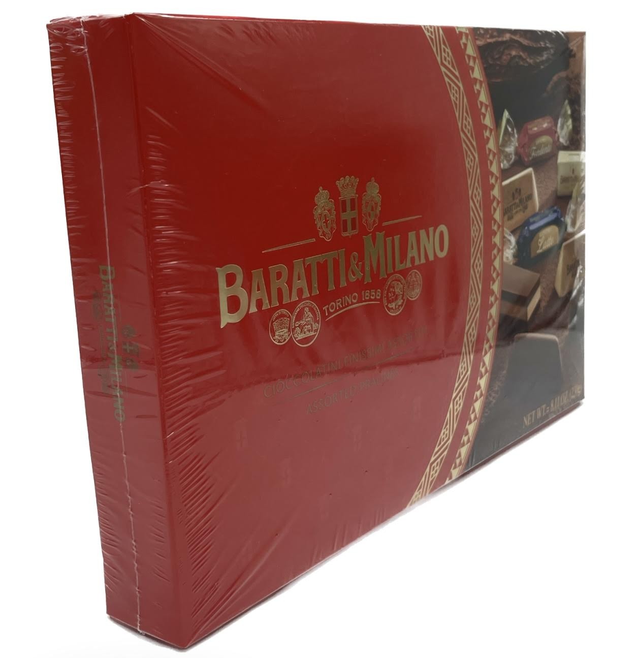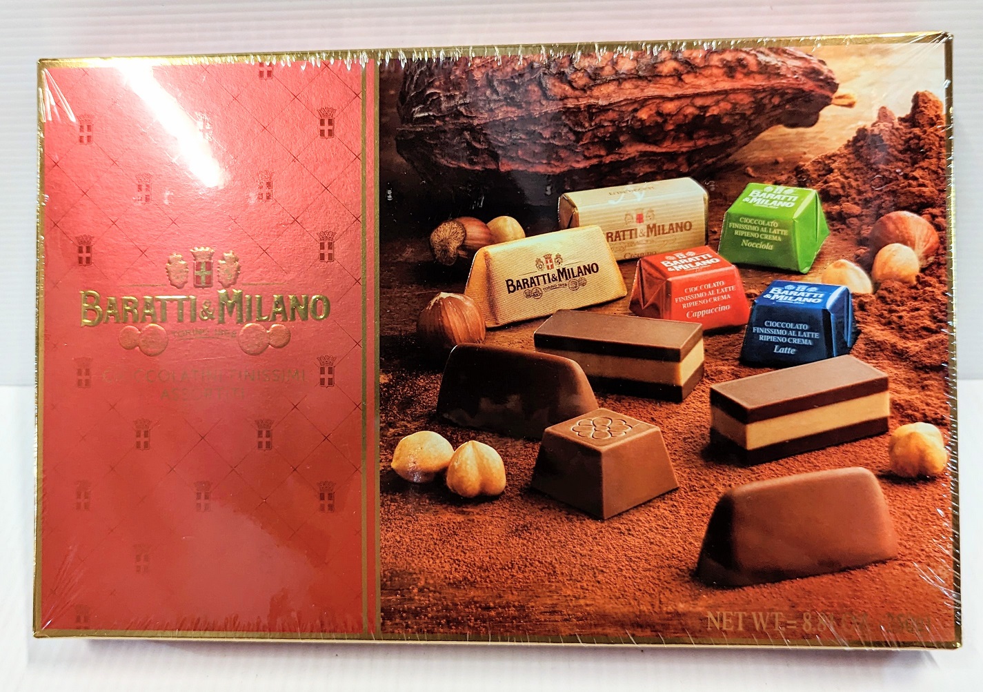 Italian assorted chocolates(Gianduiotti, pralines with milk cream, pralines with hazelnut cream, pralines with coffee cream and hazelnut cremino chocolate).