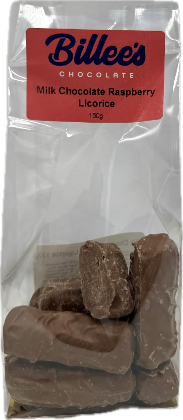 Billees Milk Chocolate Raspberry Licorice, also known as Milk Chocolate Raspberry Bullets, features a chewy, raspberry-flavored licorice center coated in smooth milk chocolate. The licorice is often described as soft and may contain natural raspberry flavoring, while the chocolate coating provides a rich, creamy counterpoint.