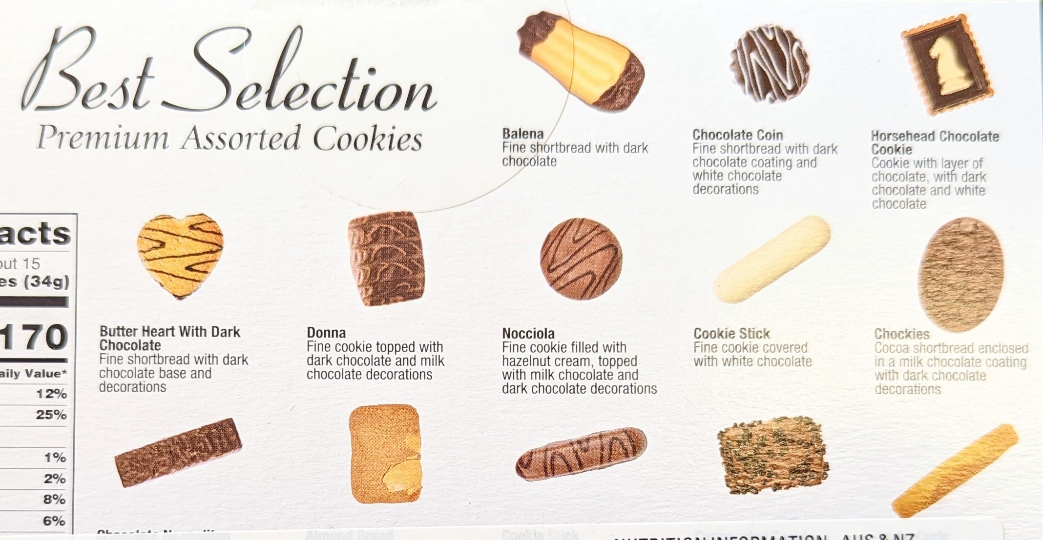 Premium assorted cookies, with dark, milk and white chocolate 520g.
