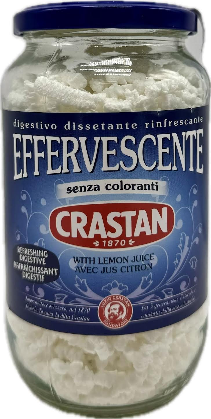 Crastan Effervescent is an Italian fizzy granular drink made with lemon, designed to be thirst-quenching and to aid digestion after a meal. Dissolved in water, it produces a refreshing lemon-flavored, fizzy drink that helps relieve feelings of heaviness and bloating. It is a natural antacid containing ingredients like sodium bicarbonate and malic acid, and is often used to provide relief from indigestion, stomach pains, and heartburn