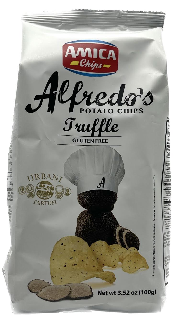 The "Alfredo's Gourmet Black Truffle" by Amica Chips are handmade crispy gourmet potato chips infused with the aroma of black Italian Truffle. These hand cooked potato chips will win you over when you try them with their unmistakable crunchiness from the extra potato skin that is double fried.