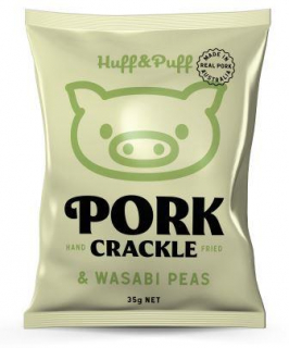 Pork crackle and wasabi peas flavoured. Crispy, crunchy, pork cracker ever made, Hand fried, sesoned with sensational spices and sealed fresh.