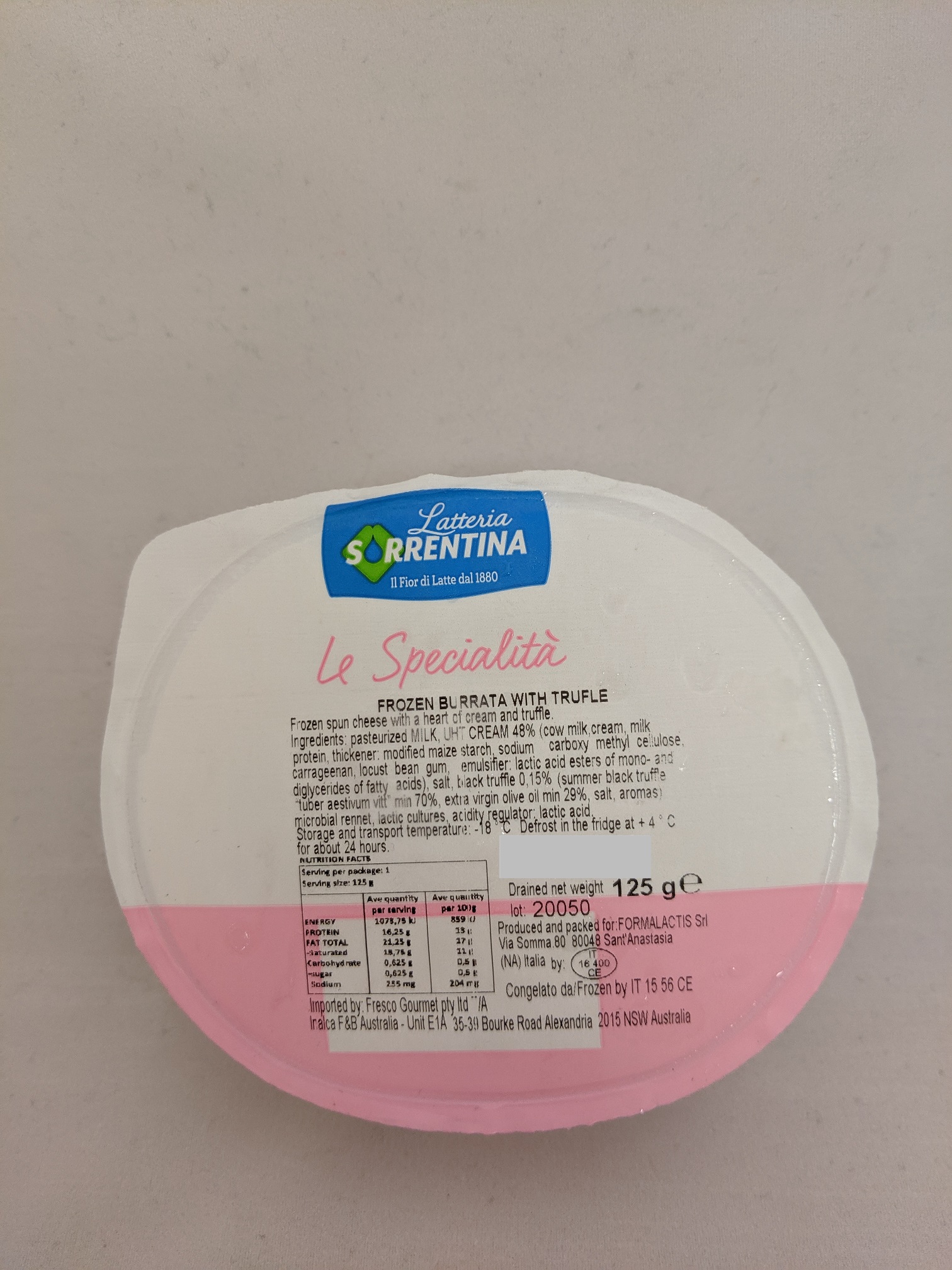Frozen Burrata cheese with truffle all the way from Italy.