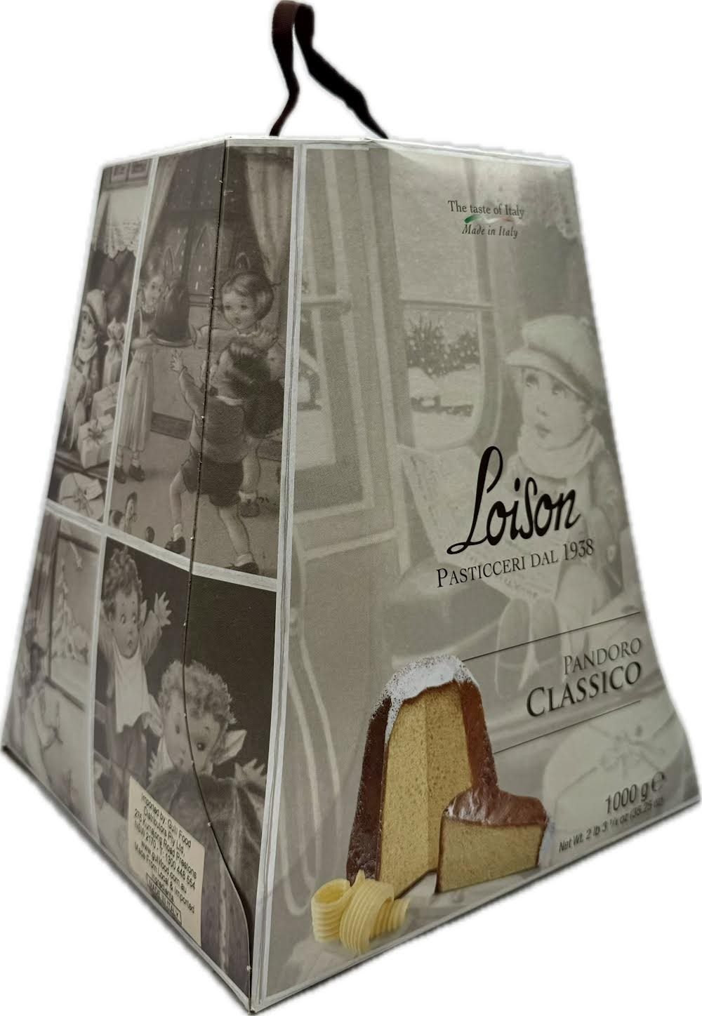 The Loison Astucci Pandoro Classic 1kg is a traditional Italian Christmas cake with a soft, golden yellow dough made with high-quality ingredients like fresh eggs, butter, and natural Madagascan vanilla. It is naturally leavened through a 72-hour process using a sourdough starter, resulting in a highly digestible and fragrant dessert that is star-shaped and served with a dusting of powdered sugar, which is included in the package.