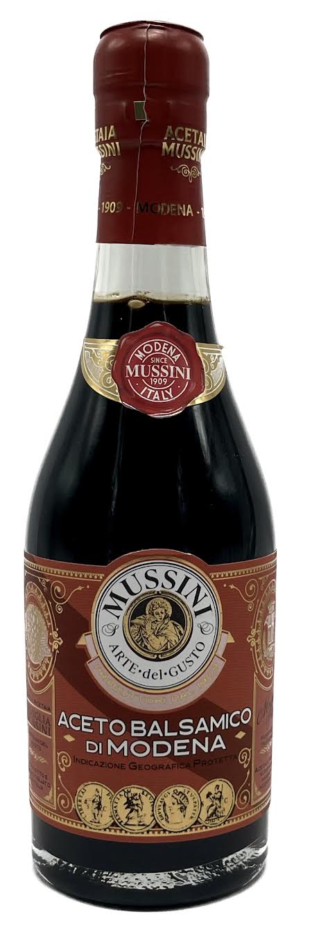 The Mussini family’s Balsamic Vinegar of Modena is a smooth, dark, glossy vinegar with bitter-sweet flavour, good density and excellent sweet-sour balance. It is obtained from a mixture of cooked musts of typical local, all-Italian grapes with small additions of good wine vinegar. It is fined with slow and constant ageing in oak barrels.
