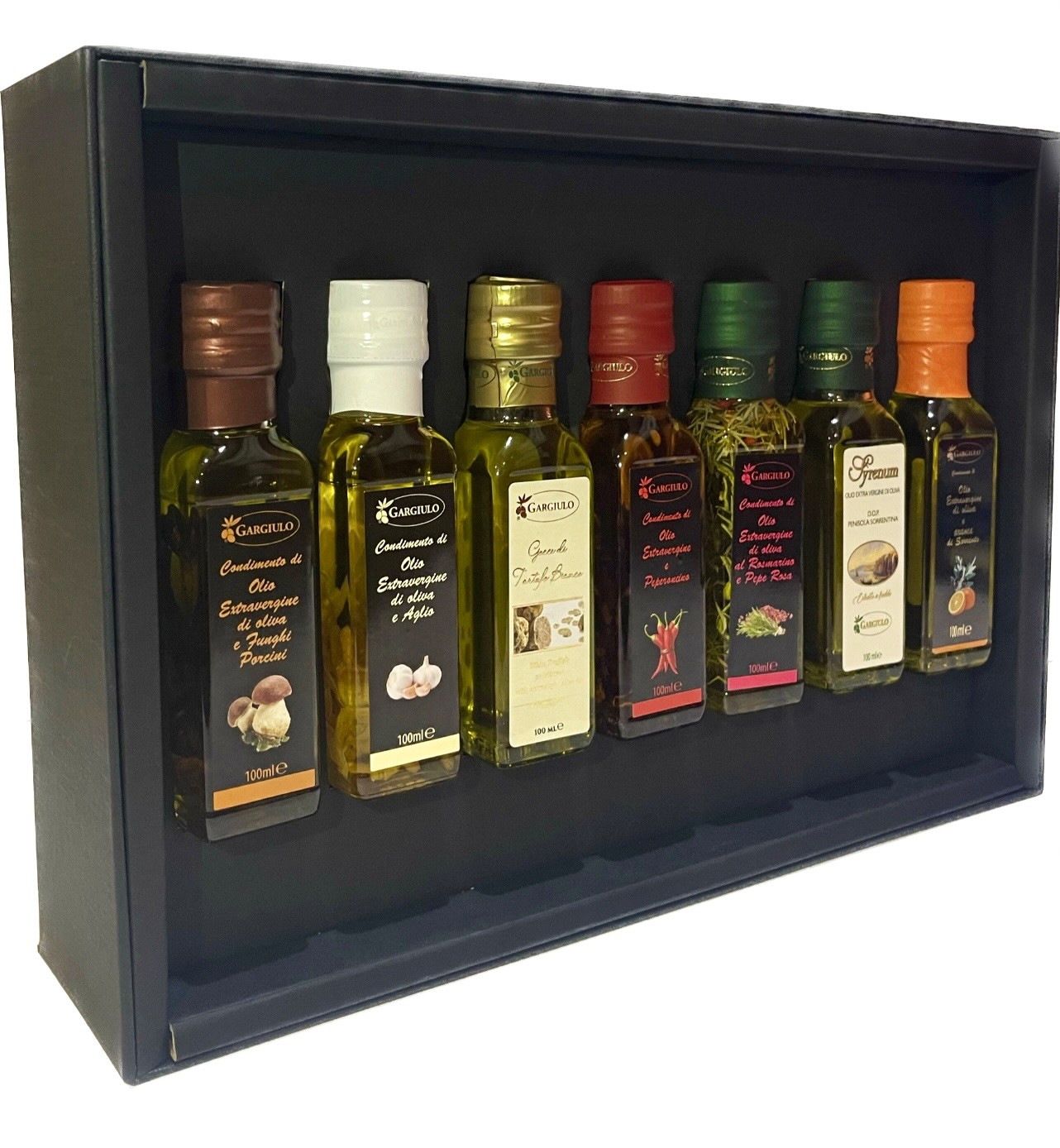 A sensory journey that will guide you to discover seven types of Italian extra virgin olive oil, with flavors and fragrances decided, packaged in an elegant gift box.