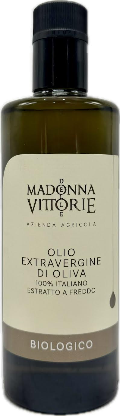 Madonna delle Vittorie Biologico Evoo (Extra Virgin Olive Oil) is an organic oil from Trentino, Italy, known for its bright green color with golden highlights and balanced flavor. It features a delicate bitterness and slight spiciness, with notes of green almond and wild thistle. The olives are cold-pressed shortly after harvesting, and the oil is made from 100% Italian organic olives.