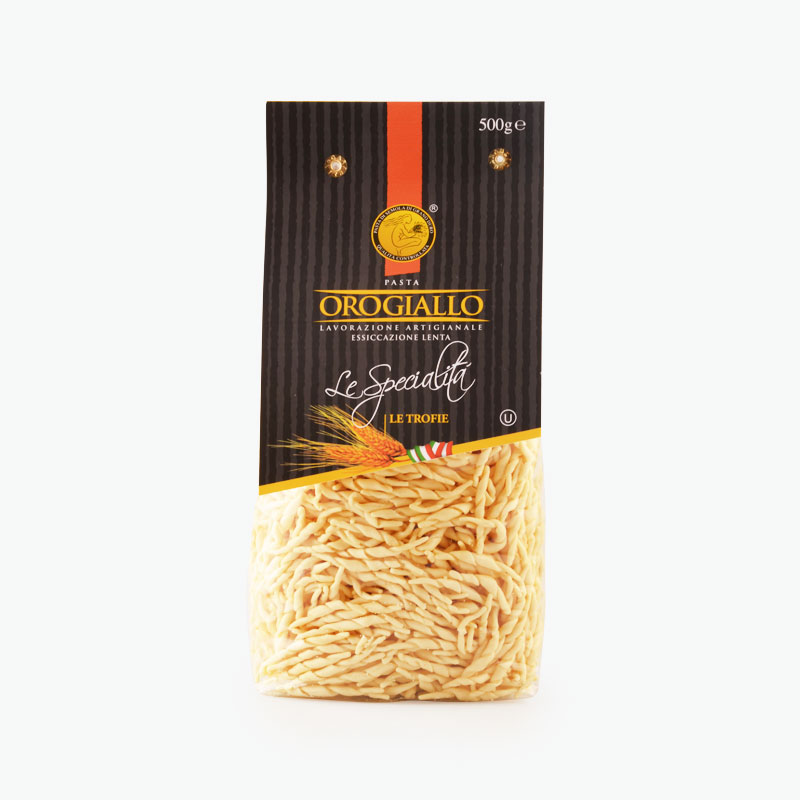 Trofie is origionally from Liguria, Northern Italy. It is shaped by rolling a small piece of dough on a flat surface to form a short, round length of pasta with tapered ends, then twisting it to form the final shape. In Italian cuisine, it is most typically served with a pesto sauce. Manufactured with slow-drying method at 60° Celsius, which better keeps nutrition and natural flavor of the pasta.
