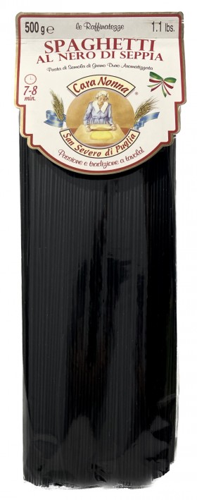 Cara Nonna Spaghetti al Nero di Seppia honours the sea's distinct flavours (Spaghetti with Squid Ink). To make this pasta, fresh black squid ink is combined with durum wheat semolina and water, giving it a lovely, dark hue and a subtle saltiness that pairs well with garlic or truffle or chilli sauce.