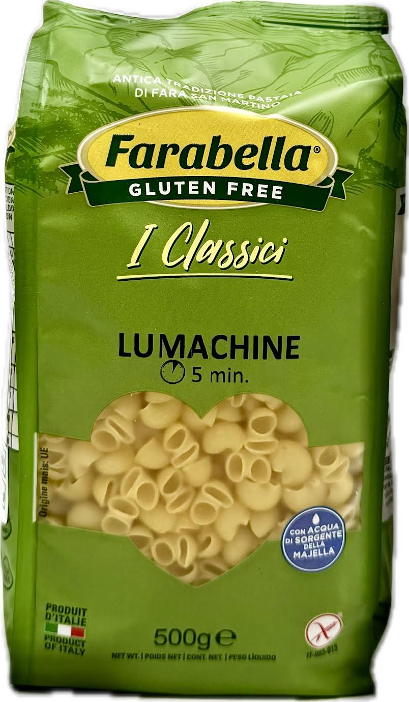 Farabella Gluten Free Lumachine pasta is a small, snail-shaped pasta made from corn flour and rice flour. It's a gluten-free option suitable for those with dietary restrictions, including those avoiding wheat, lactose, and eggs. The pasta is also free of GMOs and suitable for vegans. It's known for its ability to absorb flavors well and is ideal for both soups and dry dishes.