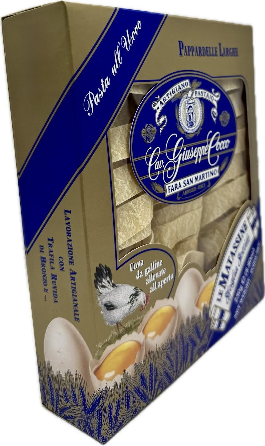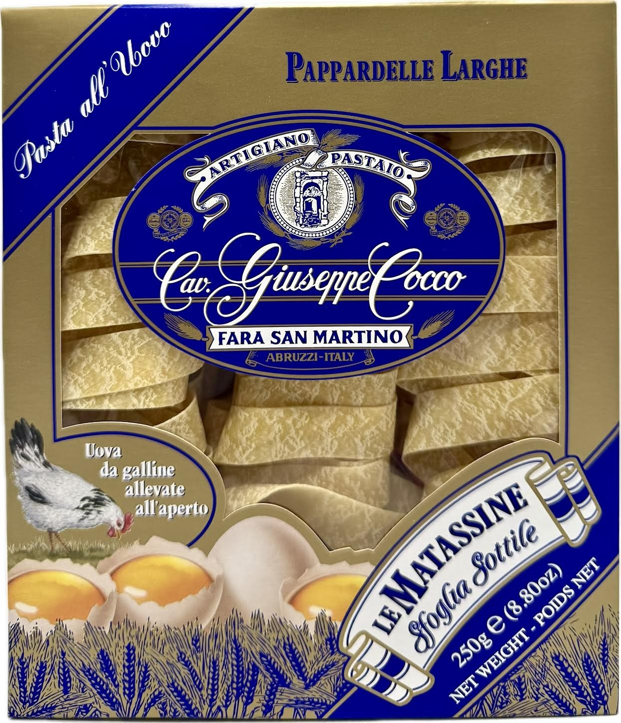 Giuseppe Cocco Pappardelle Larghe is a traditional, artisan egg pasta from Abruzzo, Italy, known for its wide, flat ribbon shape and slightly rough texture that holds hearty sauces well. It is made with premium durum wheat semolina, free-range eggs, and pure spring water, and crafted using traditional techniques like bronze dies and slow-drying for an authentic taste and texture. It's ideal for robust sauces like meat ragù and pairs well with ingredients like fresh parmesan cheese.
