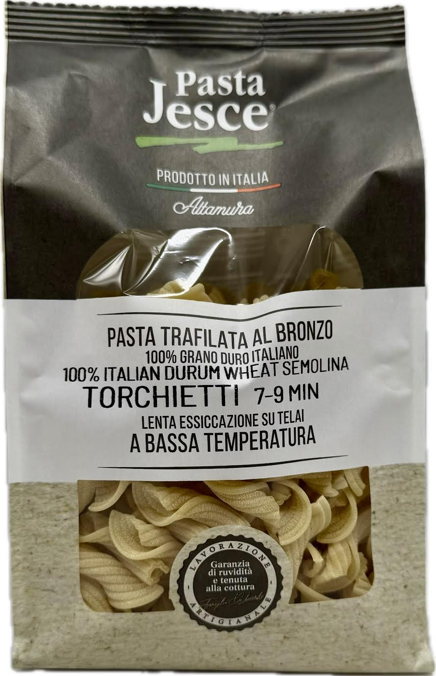 Pasta Jesce is a brand of Italian pasta known for its artisanal production methods and use of local ingredients. It is made in Altamura, Apulia, a region in Southern Italy with a strong connection to pasta-making traditions. Pasta Jesce emphasizes the use of bronze-cut dies, slow drying at low temperatures, and high-quality durum wheat semolina to produce pasta that enhances flavors and holds sauces well.
