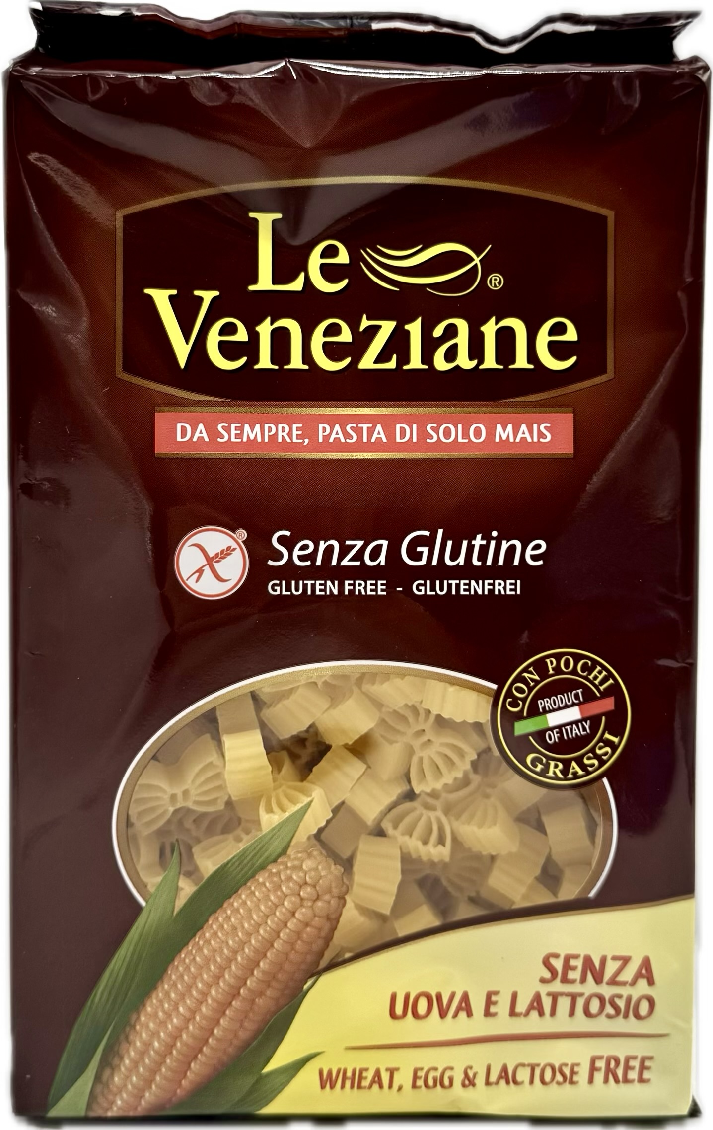 Le Veneziane Gluten Free Farfalle (bow tie) pasta is a 100% corn-based pasta made in Italy, designed for those with gluten intolerance. It's characterized by its golden color from natural carotenes in the corn and a taste and texture that closely resemble traditional wheat pasta. The pasta is also dairy-free, egg-free, and non-GMO.
