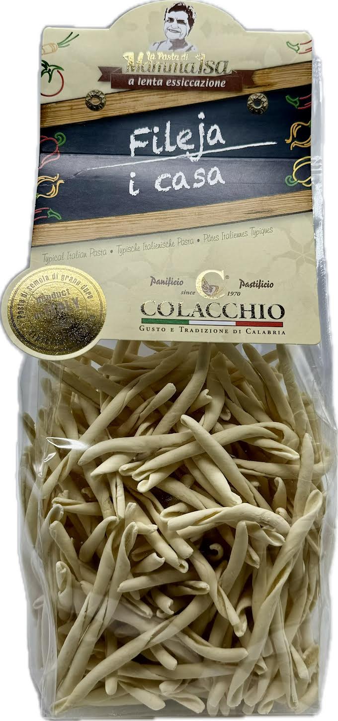 Mamma Isa Fileja I Casa Pasta is a type of artisanal pasta made from fine durum wheat semolina that is bronze-drawn and slowly dried at low temperatures, giving it an amber color and a porous texture ideal for absorbing sauces. It is an authentic Italian pasta known for its high quality, texture, and taste, pairing well with a Mediterranean diet and various sauces, such as fresh tomato and basil.