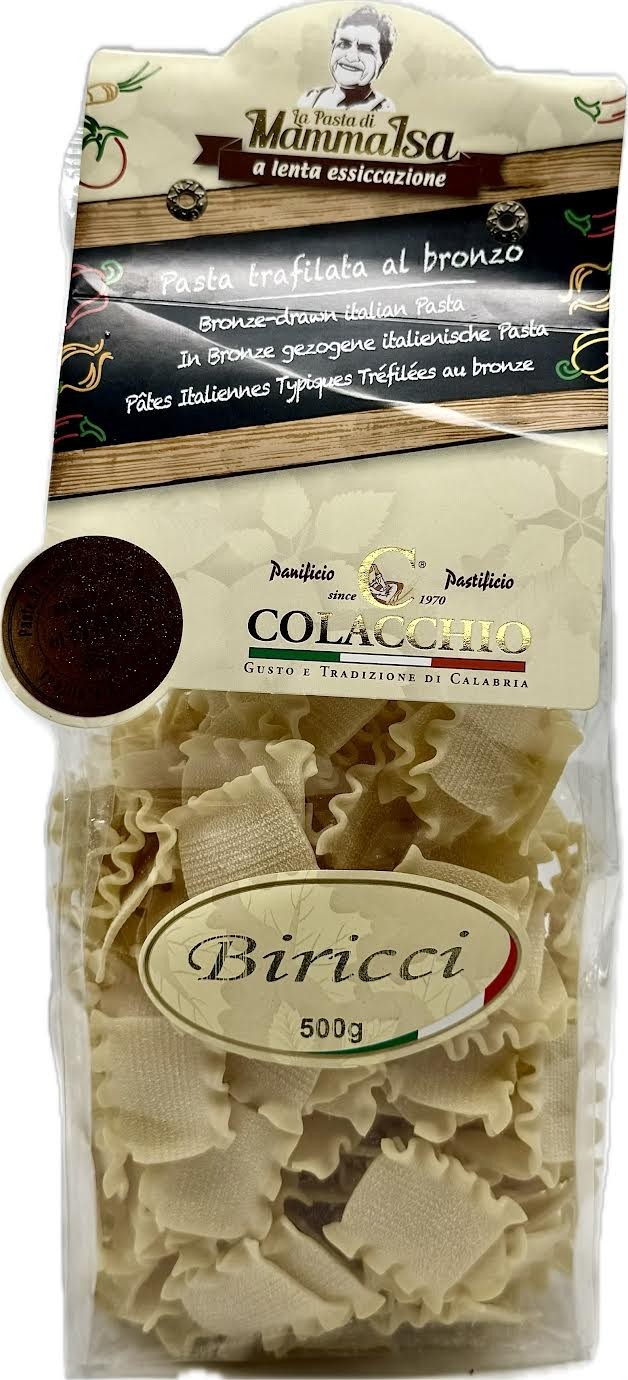 Colacchio Mamma Isa Biricci pasta is an Italian artisan pasta. Made with the best Italian durum wheat semolina, then bronze drawn and slowly dried at a low temperature for 10 hours. These characteristics give the pasta an amber colour and an ideal porosity to increase the taste to every kind of sauce.