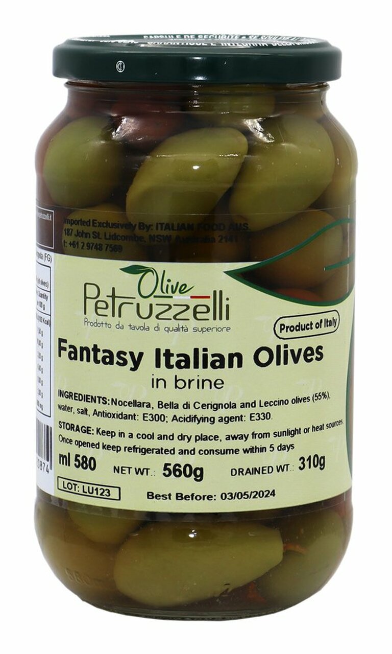 Fantasy olives (mix of Nocellara, Bella di Cerignola and Leccino olives) in brine 560g