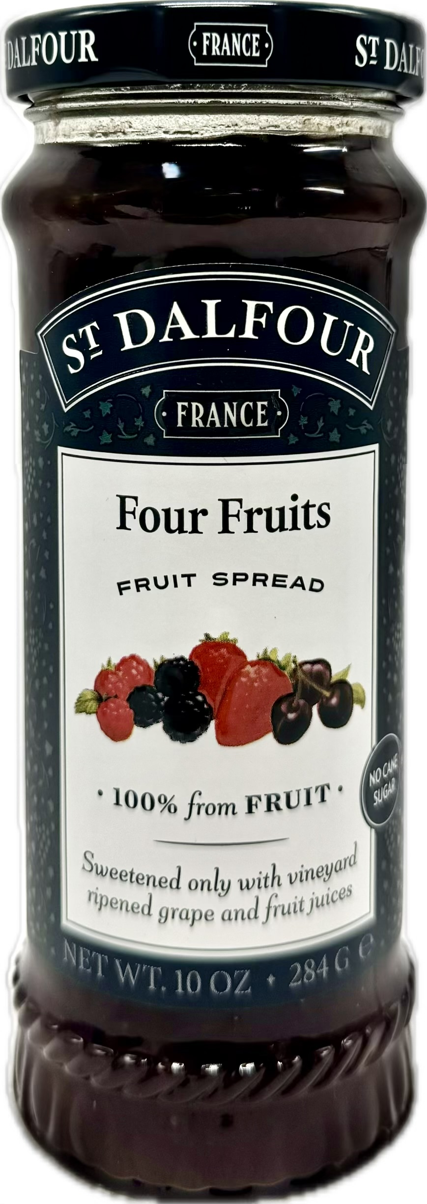 St. Dalfour Four Fruits Spread is a fruit spread made with a blend of strawberries, red raspberries, black raspberries, and black cherries. It is sweetened with fruit juice concentrates, such as grape and date juice, and contains no cane sugar or preservatives. The spread is crafted using an old French recipe and is known for its rich, natural fruit flavor.