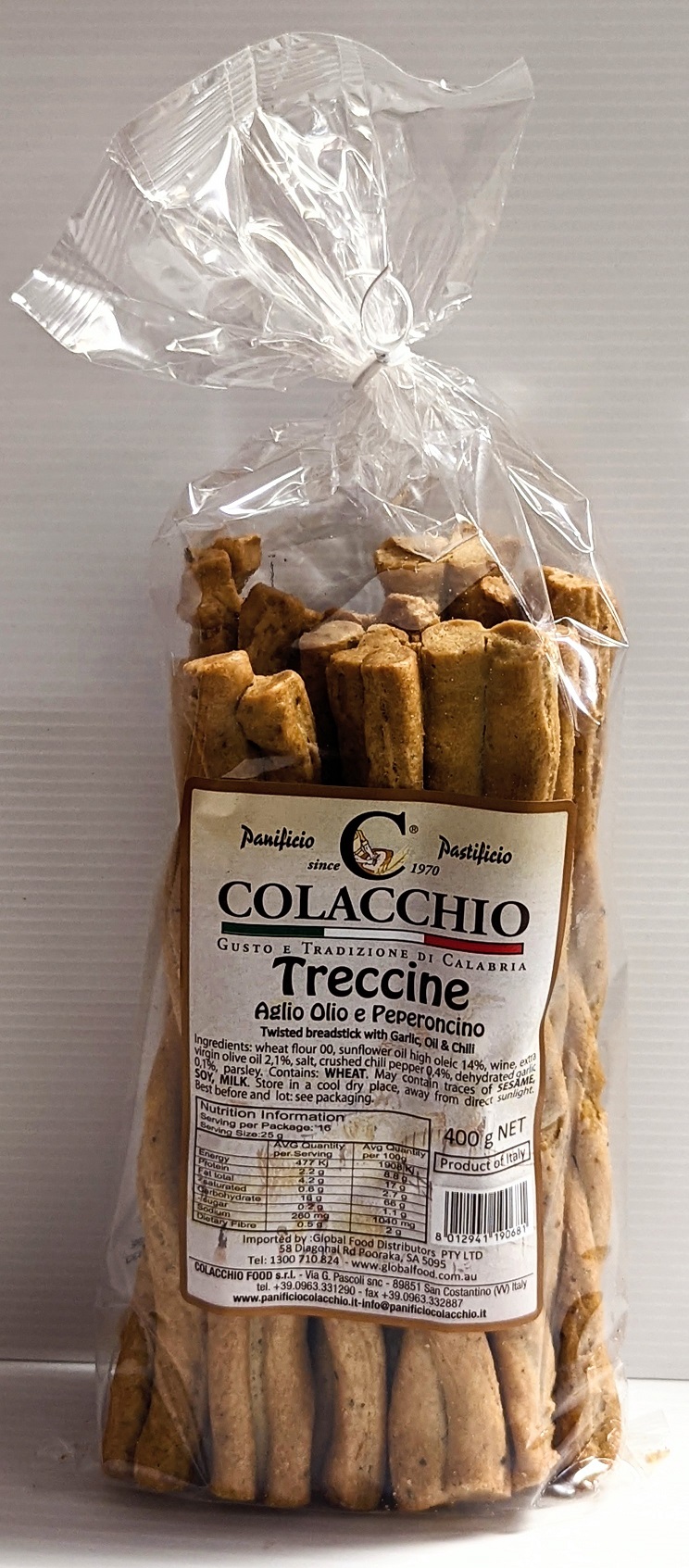 Italian twisted breadsticks flavoured with garlic, oil and chili