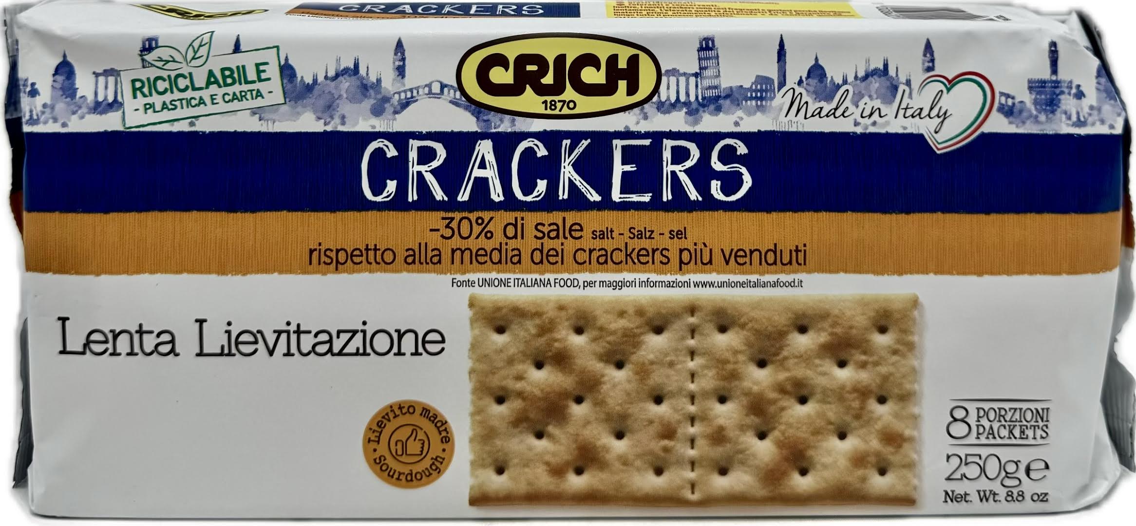 Crich Crackers are Italian-made, typically organic, high-quality biscuits known for their 24-hour natural leavening process, which results in a light and crunchy texture. Suitable for on-the-go snacking.