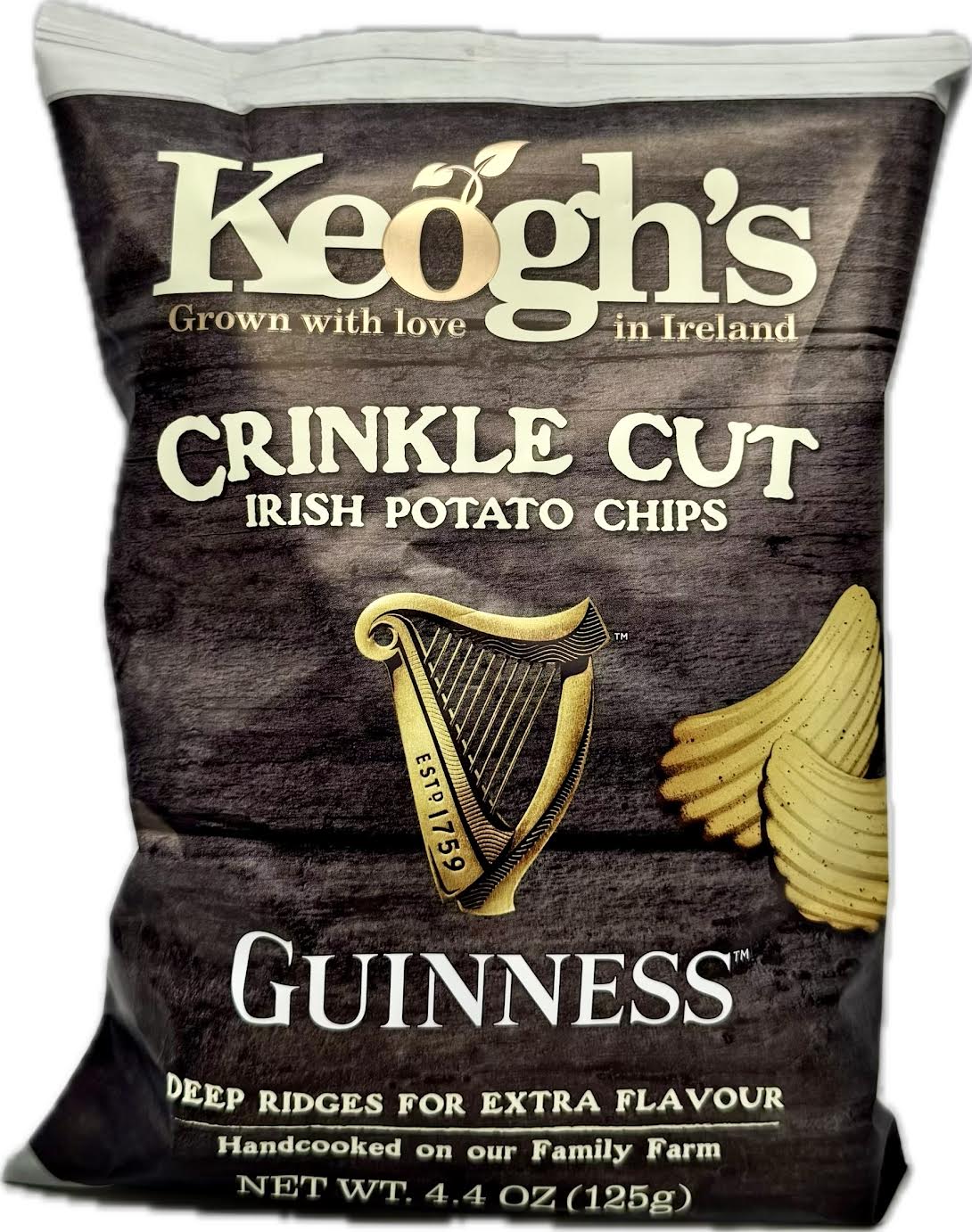 A snack made for true Guinness lovers! Keogh’s Guinness Crinkle Cut Crisps bring together the rich, roasted barley flavor of Guinness beer and the hearty crunch of hand-cooked Irish potatoes. Crafted in small batches using Keogh’s homegrown Irish spuds, these crinkle-cut crisps are seasoned with a bold, malty, slightly smoky blend inspired by the world-famous Irish stout.